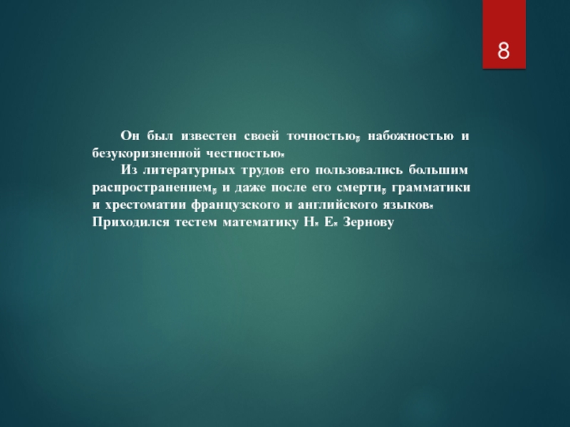 Слайд 8 Он был известен своей точностью, набожностью и безукоризненной честностью.