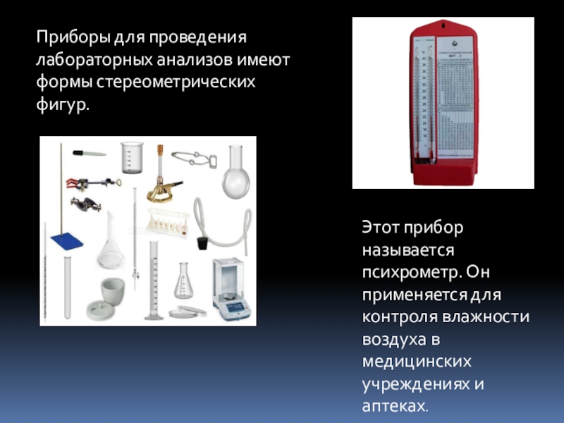 Приборы для проведения лабораторных анализов имеют формы стереометрических фигур.