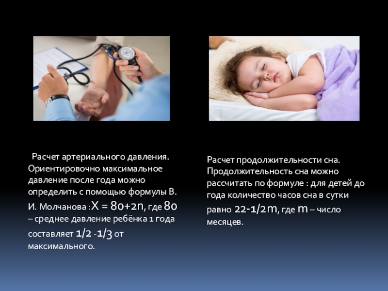 Расчет артериального давления. Ориентировочно максимальное давление после года можно определить с помощью формулы В. И. Молчанова :Х = 80+2n, где 80 – среднее давление ребёнка 1 года составляет 1/2 -1/3 от максимального.