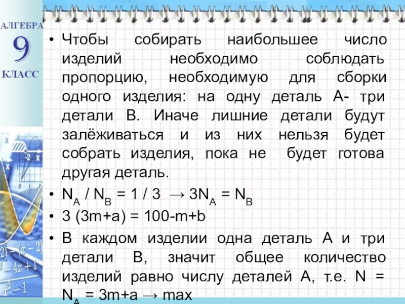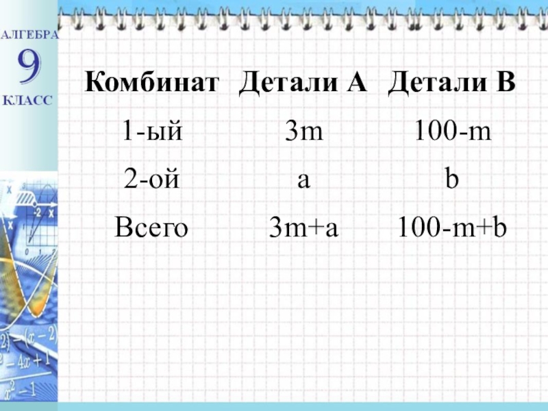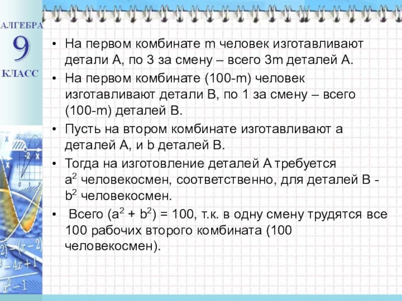 Слайд 38На первом комбинате m человек изготавливают детали A, по 3 за