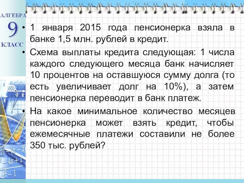 Слайд 131 января 2015 года пенсионерка взяла в банке 1,5 млн. рублей