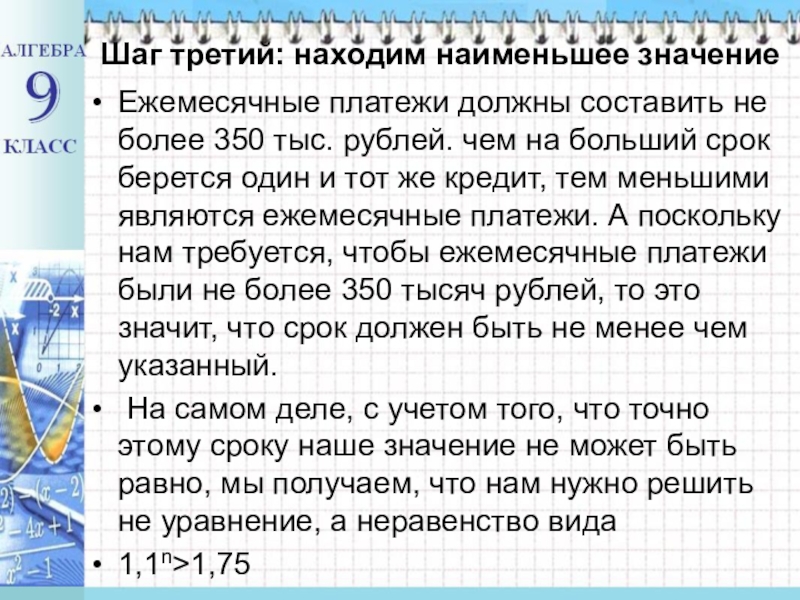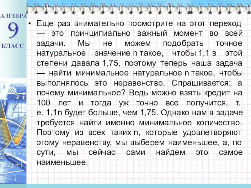 момент во всей задачи. Мы не можем подобрать точное натуральное значение n такое, чтобы 1,1 в этой степени давала 1,75, поэтому теперь наша задача — найти минимальное натуральное n такое, чтобы выполнялось это неравенство. Спрашивается: а почему минимальное? Ведь можно взять кредит на 100 лет и тогда уж точно все получится, т.е. 1,1n будет больше, чем 1,75. Однако нам в задаче требуется найти именно минимальное количество. Поэтому из всех таких n, которые удовлетворяют этому неравенству, мы выберем наименьшее, а, по сути, мы сейчас сами найдем это самое наименьшее.