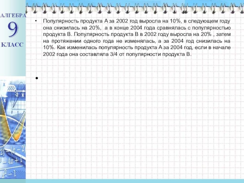 Слайд 7Популярность продукта A за 2002 год выросла на 10%, в следующем