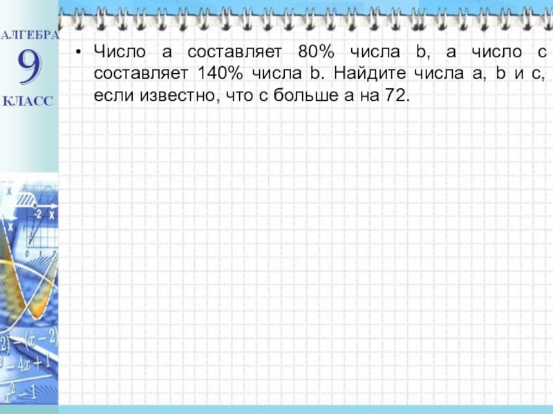 Слайд 4Число a составляет 80% числа b, а число c составляет 140%