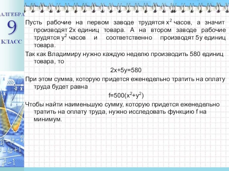Слайд 35Пусть рабочие на первом заводе трудятся x2 часов, а значит производят 2x единиц товара. А