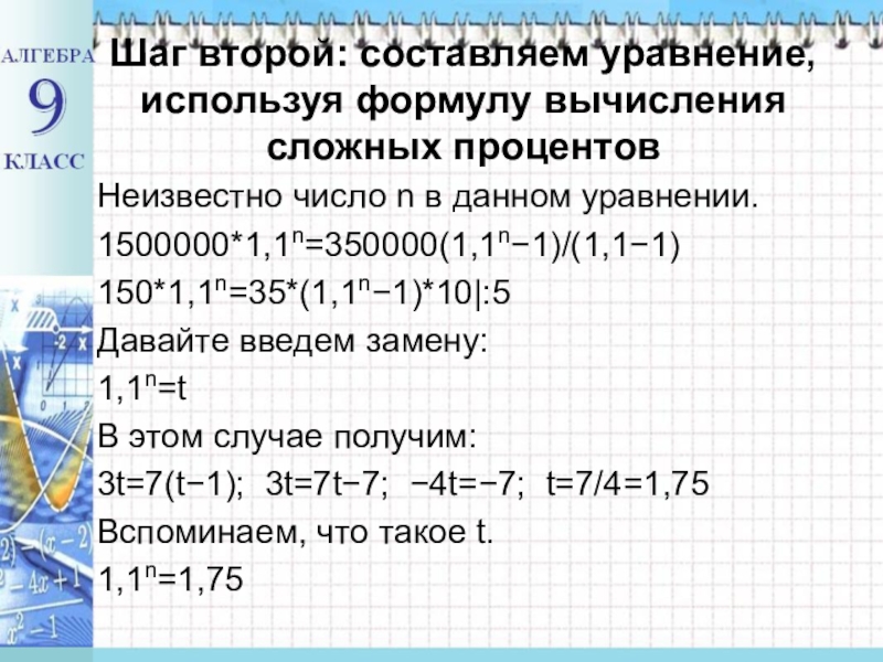 Слайд 15Шаг второй: составляем уравнение, используя формулу вычисления сложных процентов