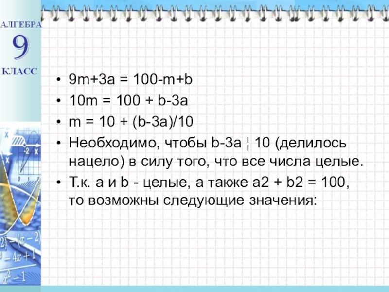 Т.к. a и b - целые, а также a2 + b2 = 100, то возможны следующие значения:
