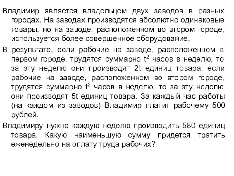 В результате, если рабочие на заводе, расположенном в первом городе, трудятся суммарно t2 часов в неделю, то за эту неделю они производят 2t единиц товара; если рабочие на заводе, расположенном во втором городе, трудятся суммарно t2 часов в неделю, то за эту неделю они производят 5t единиц товара. За каждый час работы (на каждом из заводов) Владимир платит рабочему 500 рублей.