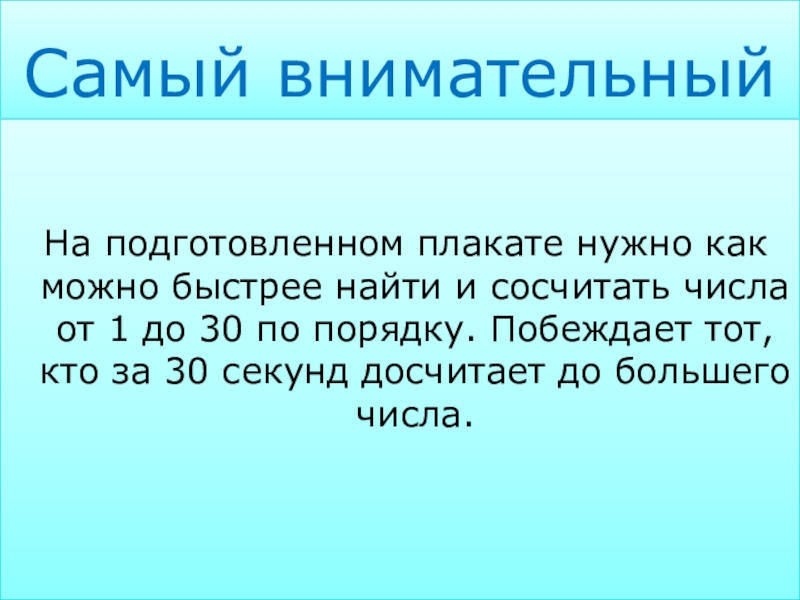 сосчитать числа от 1 до 30 по порядку. Побеждает тот, кто за 30 секунд досчитает до большего числа.