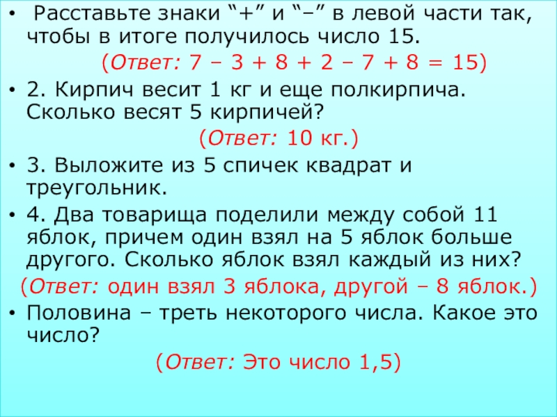 2. Кирпич весит 1 кг и еще полкирпича. Сколько весят 5 кирпичей?