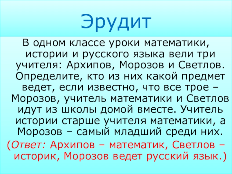 (Ответ: Архипов – математик, Светлов – историк, Морозов ведет русский язык.)