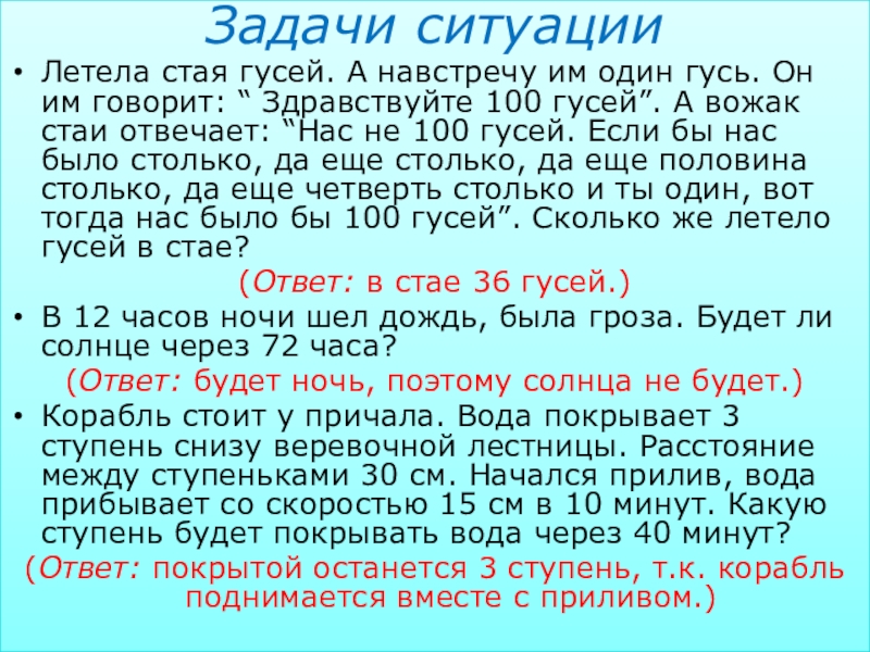 им говорит: “ Здравствуйте 100 гусей”. А вожак стаи отвечает: “Нас не 100 гусей. Если бы нас было столько, да еще столько, да еще половина столько, да еще четверть столько и ты один, вот тогда нас было бы 100 гусей”. Сколько же летело гусей в стае?