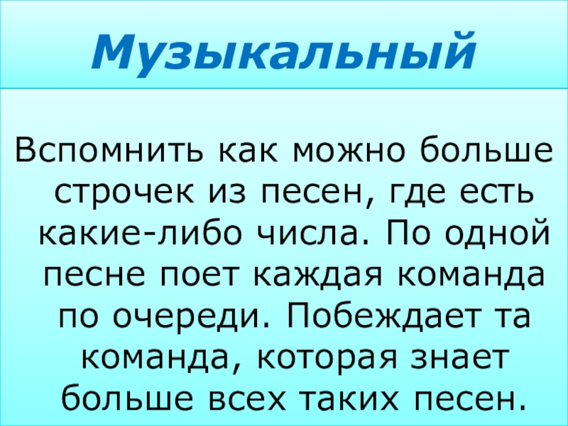 Вспомнить как можно больше строчек из песен, где есть какие-либо числа.