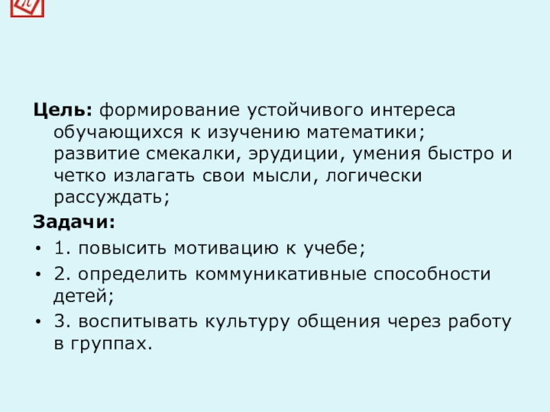 Цель: формирование устойчивого интереса обучающихся к изучению математики; развитие смекалки, эрудиции,