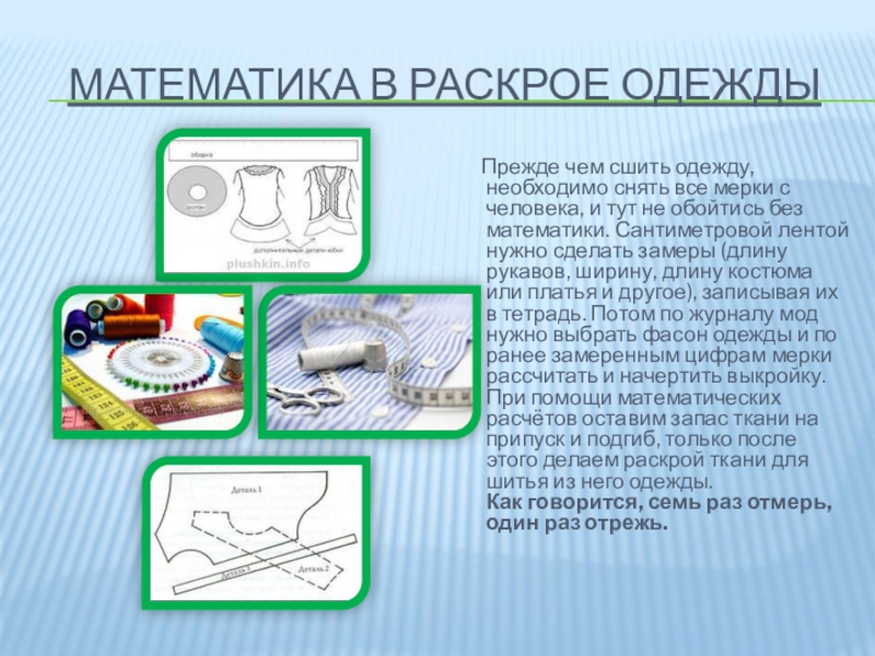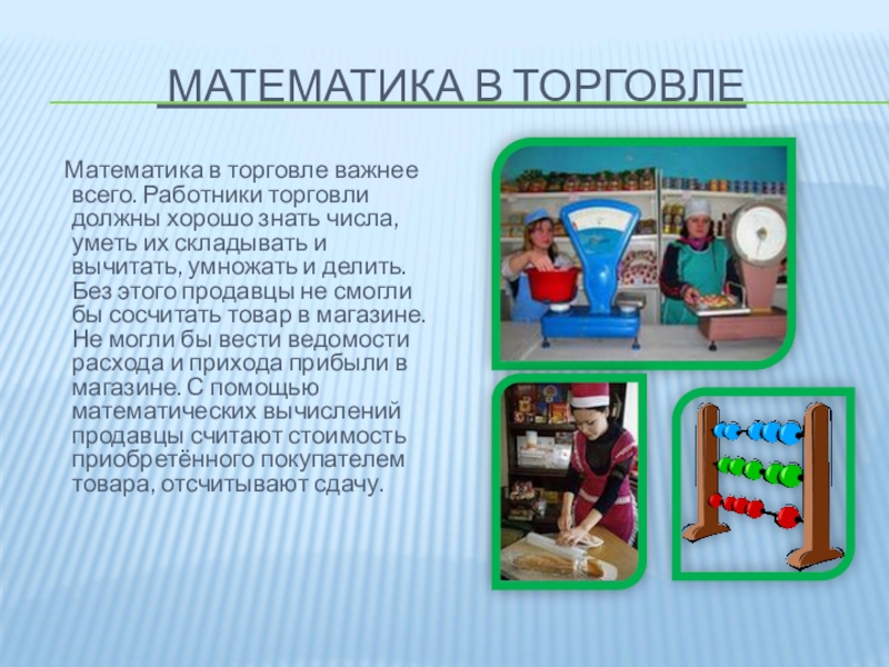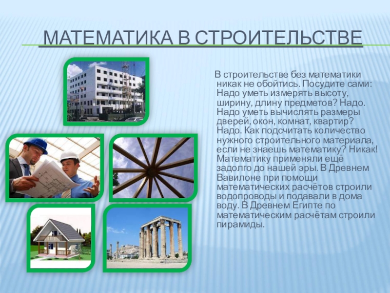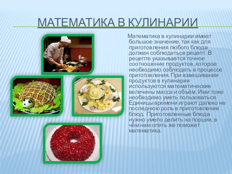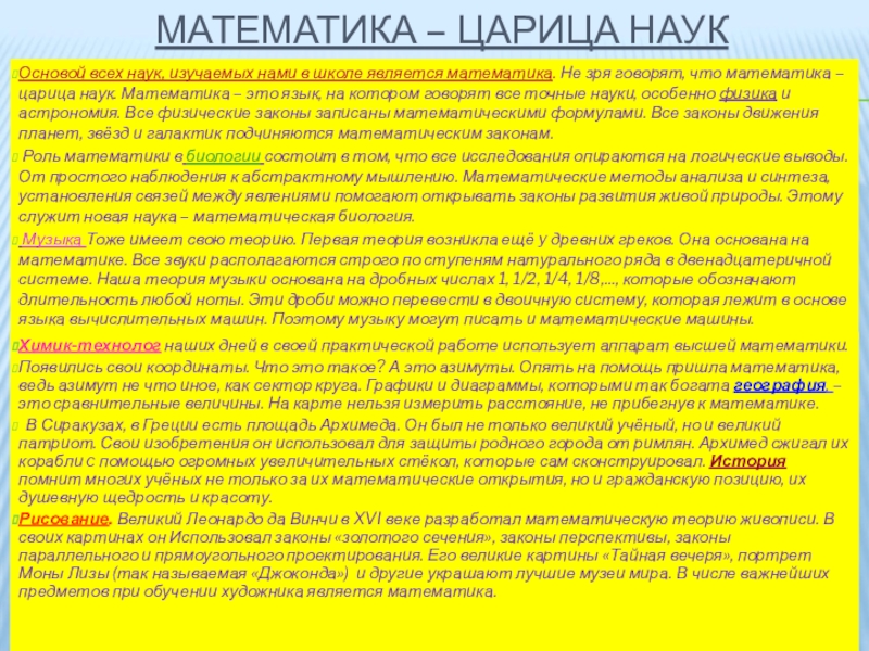 Рисование. Великий Леонардо да Винчи в XVI веке разработал математическую теорию живописи. В своих картинах он Использовал законы «золотого сечения», законы перспективы, законы параллельного и прямоугольного проектирования. Его великие картины «Тайная вечеря», портрет Моны Лизы (так называемая «Джоконда») и другие украшают лучшие музеи мира. B числе важнейших предметов при обучении художника является математика.