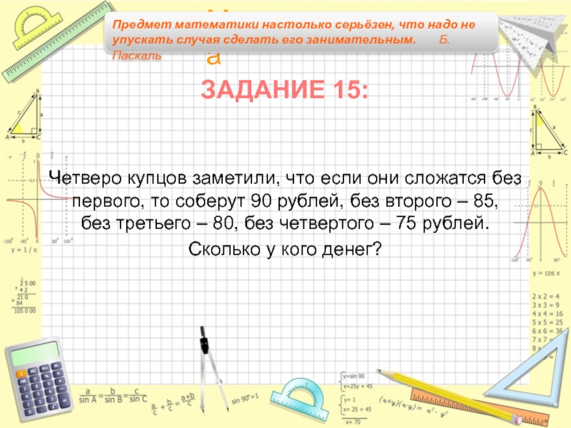Четверо купцов заметили, что если они сложатся без первого, то соберут 90 рублей, без второго – 85,