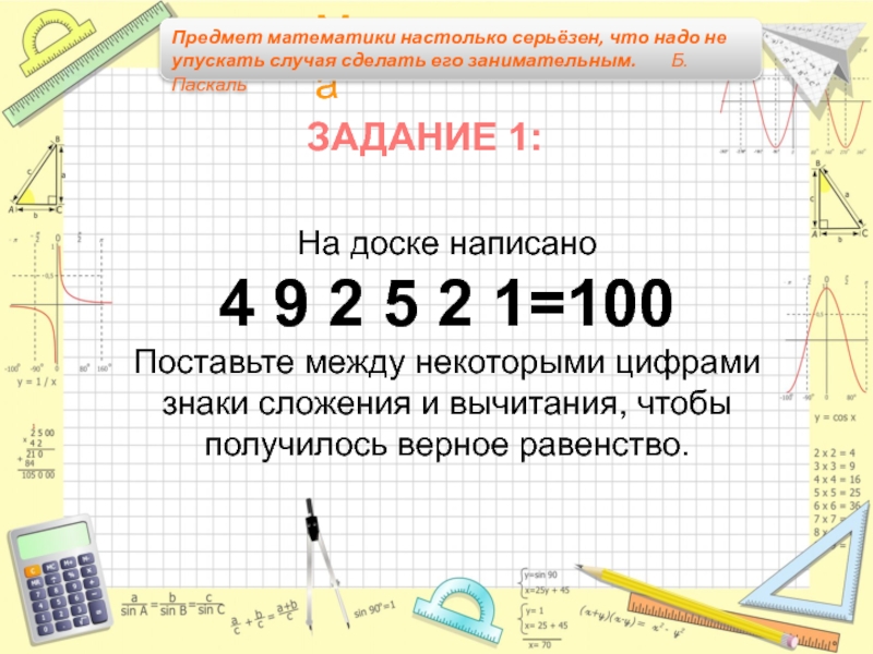 Поставьте между некоторыми цифрами знаки сложения и вычитания, чтобы получилось верное равенство.