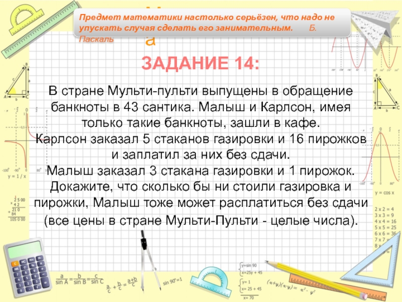 В стране Мульти-пульти выпущены в обращение банкноты в 43 сантика. Малыш и Карлсон, имея только такие банкноты, зашли в кафе.
