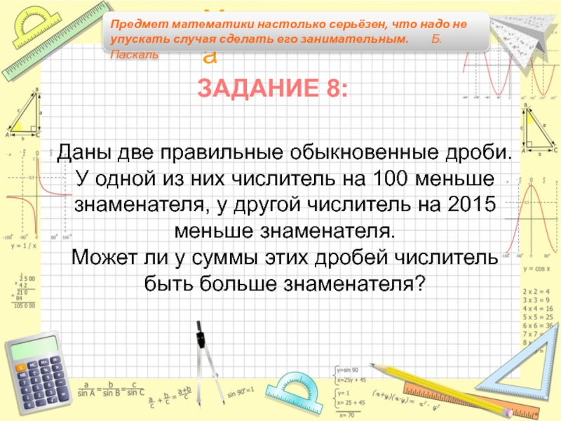 Даны две правильные обыкновенные дроби. У одной из них числитель на 100 меньше знаменателя, у другой числитель на 2015 меньше знаменателя.