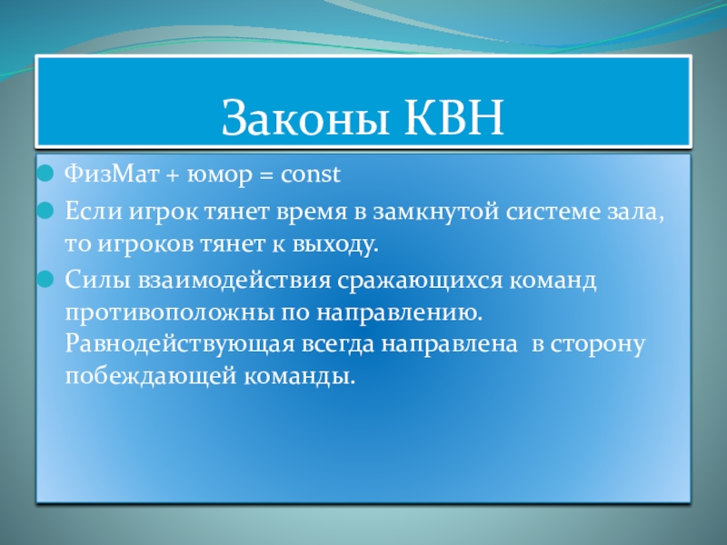 Законы КВНФизМат + юмор = constЕсли игрок тянет время в замкнутой системе зала, то игроков тянет к выходу.Силы взаимодействия сражающихся команд противоположны по направлению. Равнодействующая всегда направлена в сторону побеждающей команды.