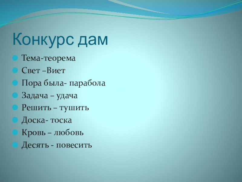 Конкурс дамТема-теоремаСвет –ВиетПора была- параболаЗадача – удачаРешить – тушитьДоска- тоскаКровь – любовьДесять - повесить