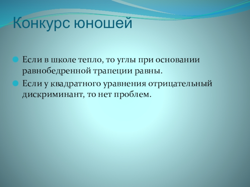 Конкурс юношей Если в школе тепло, то углы при основании равнобедренной трапеции равны.Если у квадратного уравнения отрицательный