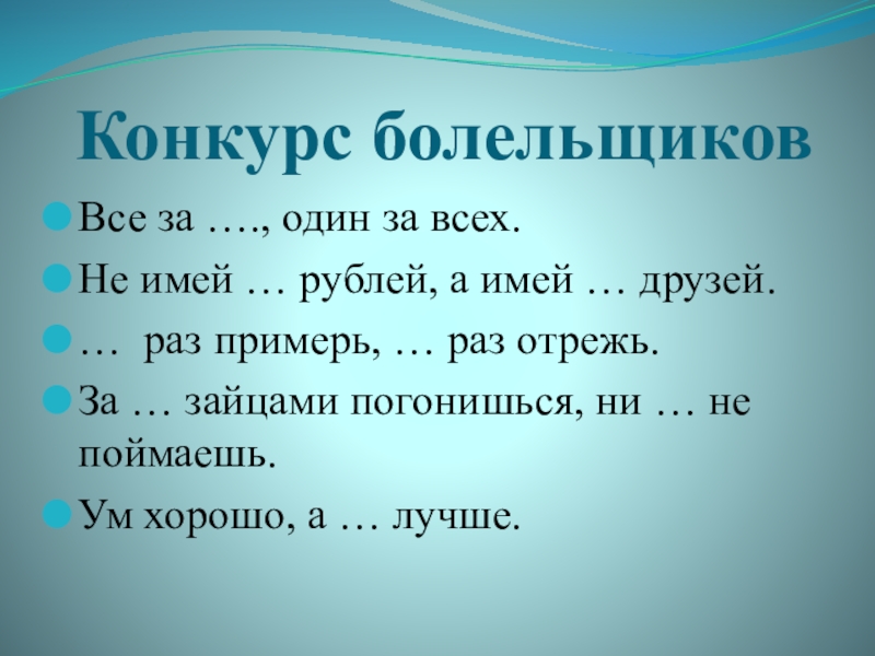 Конкурс болельщиковВсе за …., один за всех.Не имей … рублей, а имей … друзей.… раз примерь,