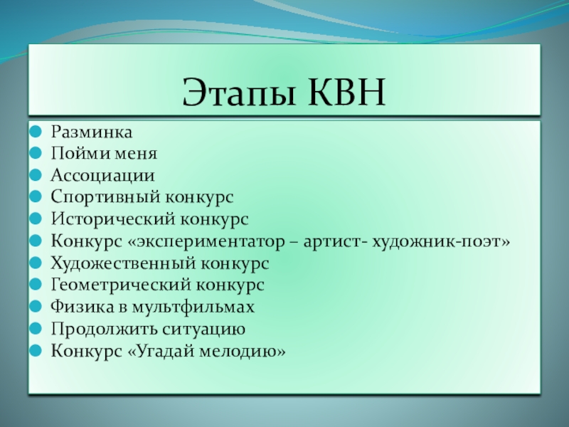 Этапы КВНРазминка Пойми меняАссоциацииСпортивный конкурсИсторический конкурсКонкурс «экспериментатор – артист- художник-поэт»Художественный конкурсГеометрический конкурсФизика в мультфильмахПродолжить ситуациюКонкурс «Угадай мелодию»