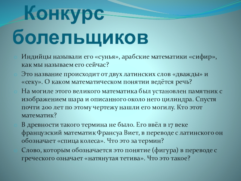 Конкурс болельщиковИндийцы называли его «сунья», арабские математики «сифир», как мы называем его сейчас?Это название происходит