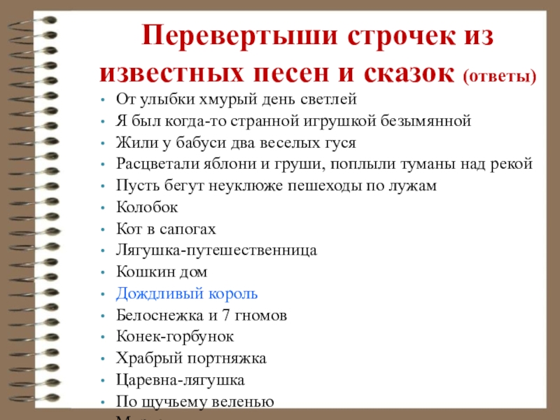 Слайд 134Перевертыши строчек из известных песен и сказок (ответы)