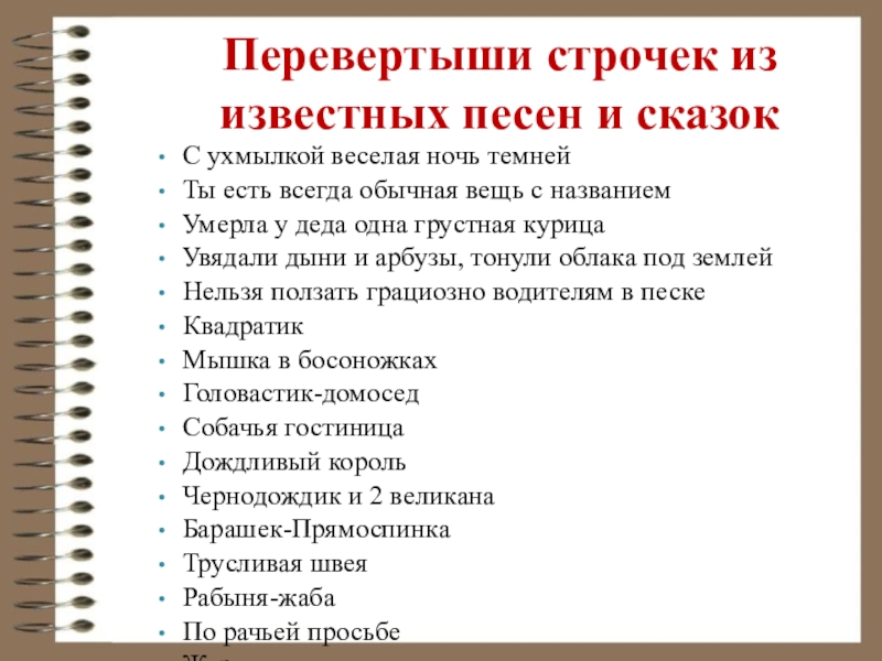 Слайд 133Перевертыши строчек из известных песен и сказок