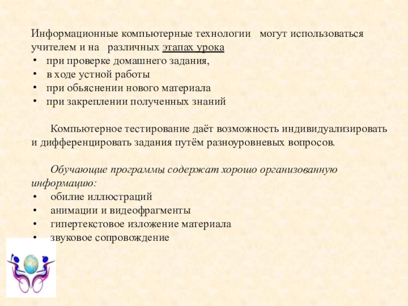 Слайд 6Информационные компьютерные технологии могут использоваться учителем и на различных