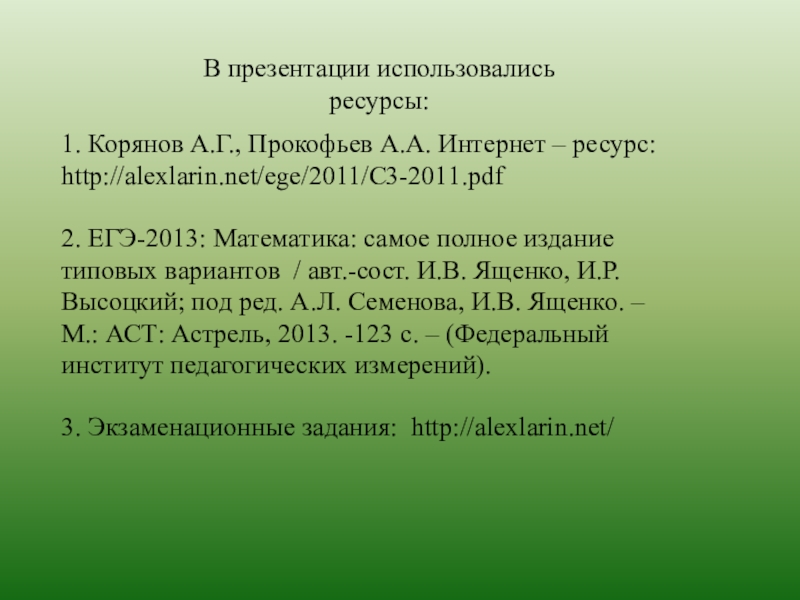 2. ЕГЭ-2013: Математика: самое полное издание типовых вариантов / авт.-сост. И.В. Ященко, И.Р. Высоцкий; под ред. А.Л. Семенова, И.В. Ященко. – М.: АСТ: Астрель, 2013. -123 с. – (Федеральный институт педагогических измерений).
