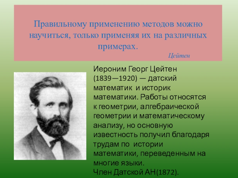 Иероним Георг Цейтен (1839—1920) — датский математик и историк математики. Работы относятся к геометрии, алгебраической геометрии и математическому анализу, но основную известность получил благодаря трудам по истории математики, переведенным на многие языки.