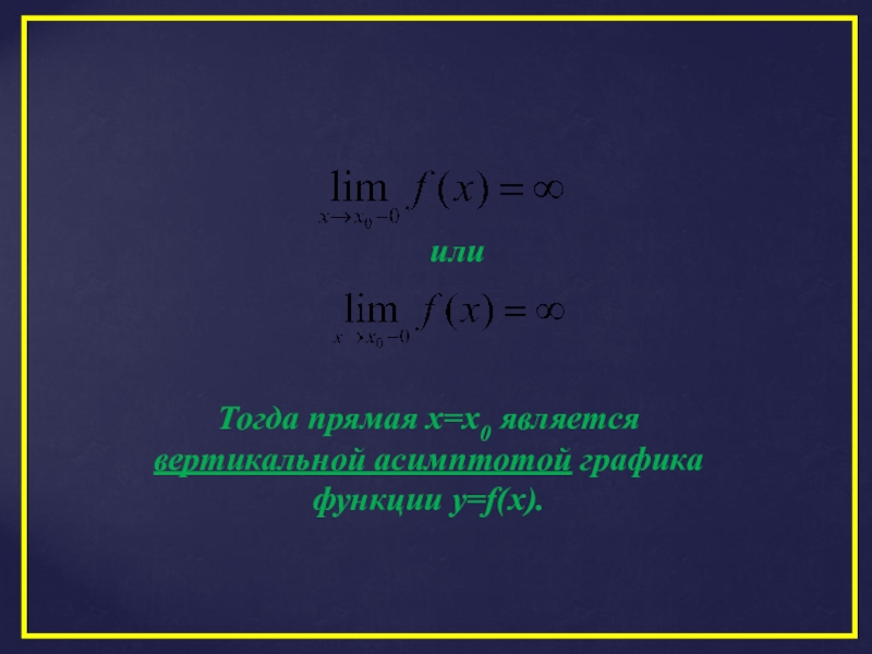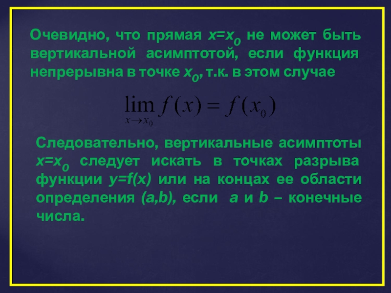 Следовательно, вертикальные асимптоты х=х0 следует искать в точках разрыва функции y=f(x) или на концах ее области определения (a,b), если a и b – конечные числа.