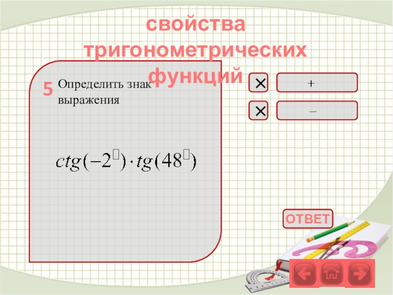4) 360<400<360+90 (I четверть), ctg 400>0.