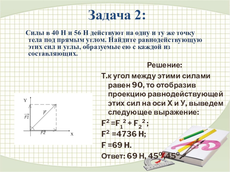 Т.к угол между этими силами равен 90, то отобразив проекцию равнодействующей этих сил на оси Х и У, выведем следующее выражение: