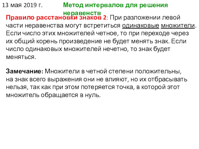 Замечание: Множители в четной степени положительны, на знак всего выражения они не влияют, но их отбрасывать нельзя, так как при этом потеряется точка, в которой этот множитель обращается в нуль.