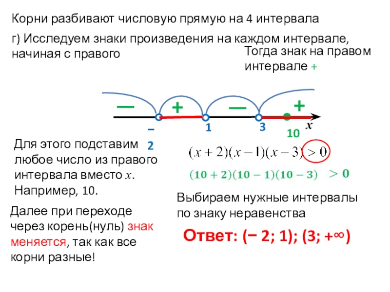 г) Исследуем знаки произведения на каждом интервале, начиная с правого