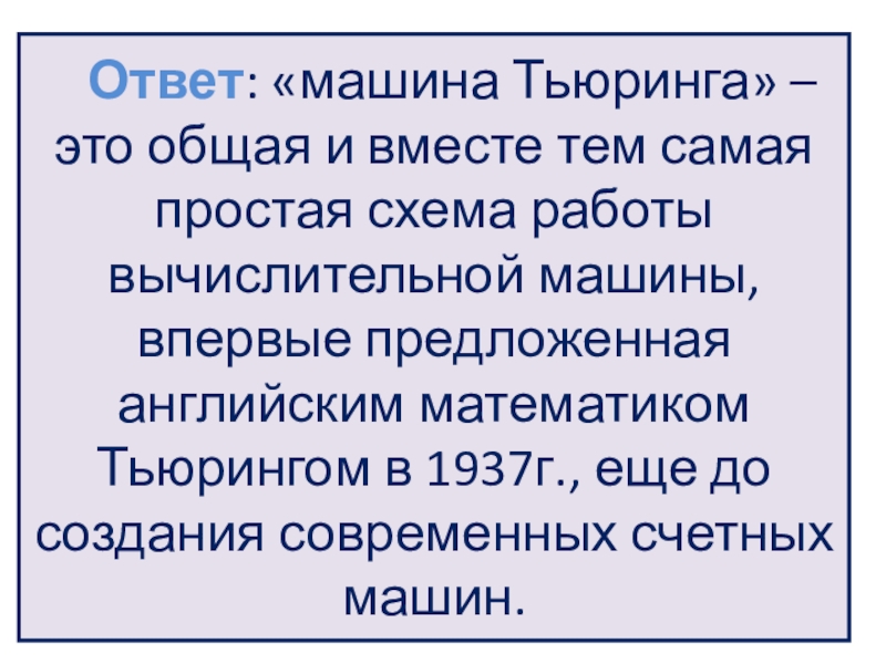 Слайд 19 Ответ: «машина Тьюринга» – это общая и вместе тем