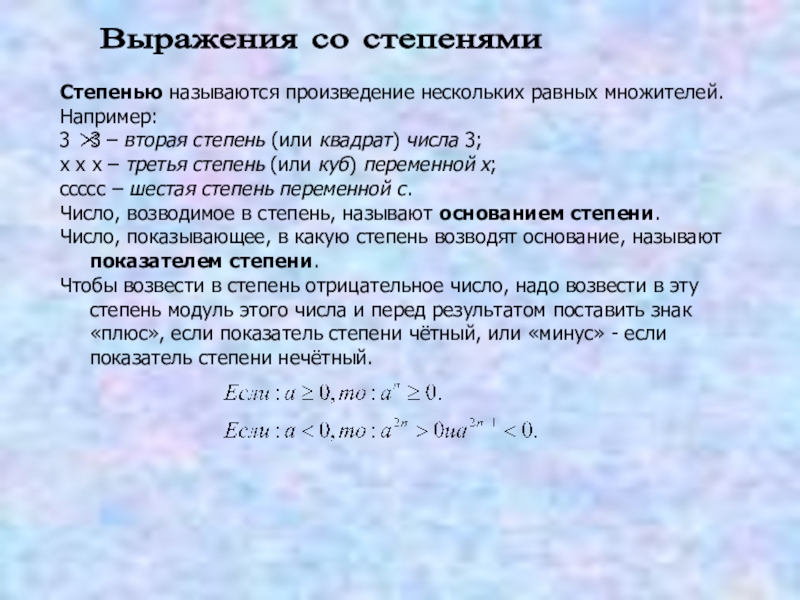 Чтобы возвести в степень отрицательное число, надо возвести в эту степень модуль этого числа и перед результатом поставить знак «плюс», если показатель степени чётный, или «минус» - если показатель степени нечётный.