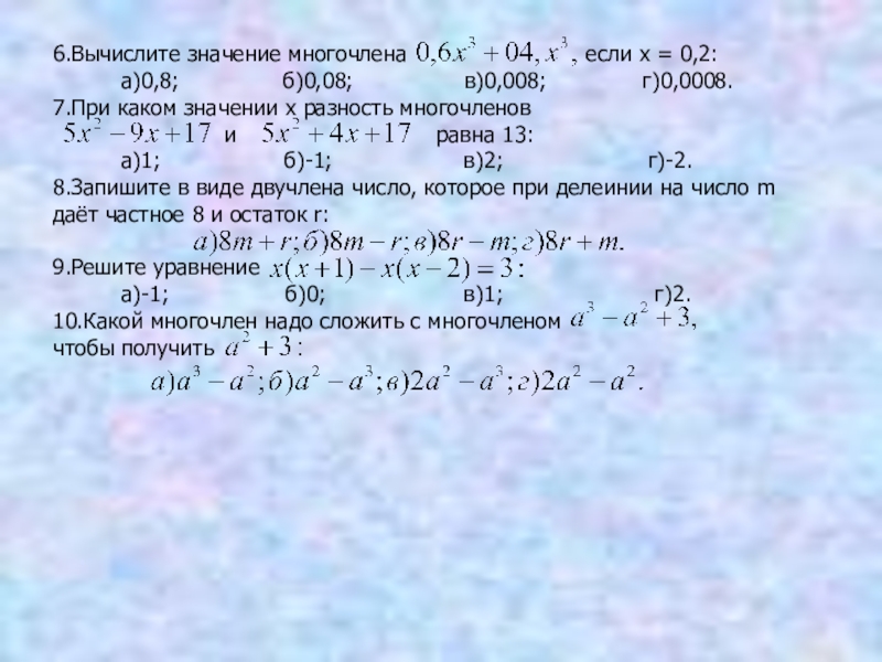 8.Запишите в виде двучлена число, которое при делеинии на число m даёт частное 8 и остаток r: