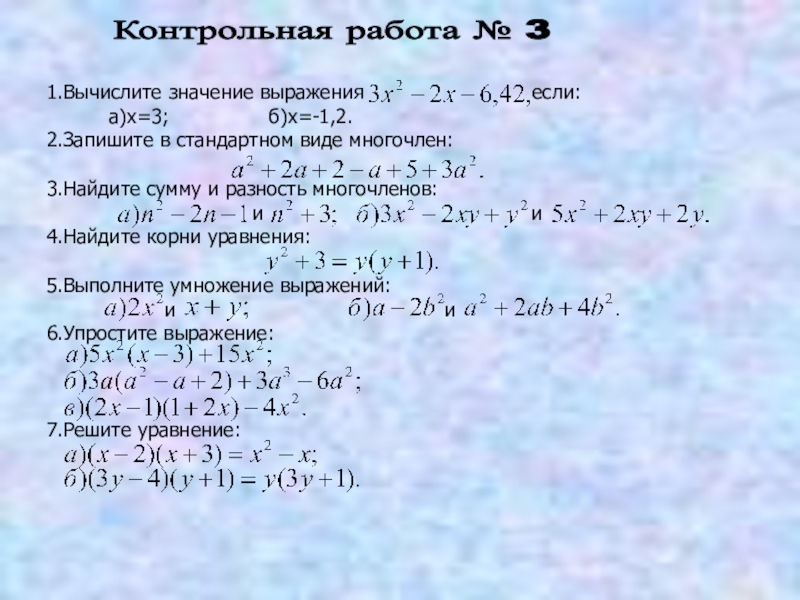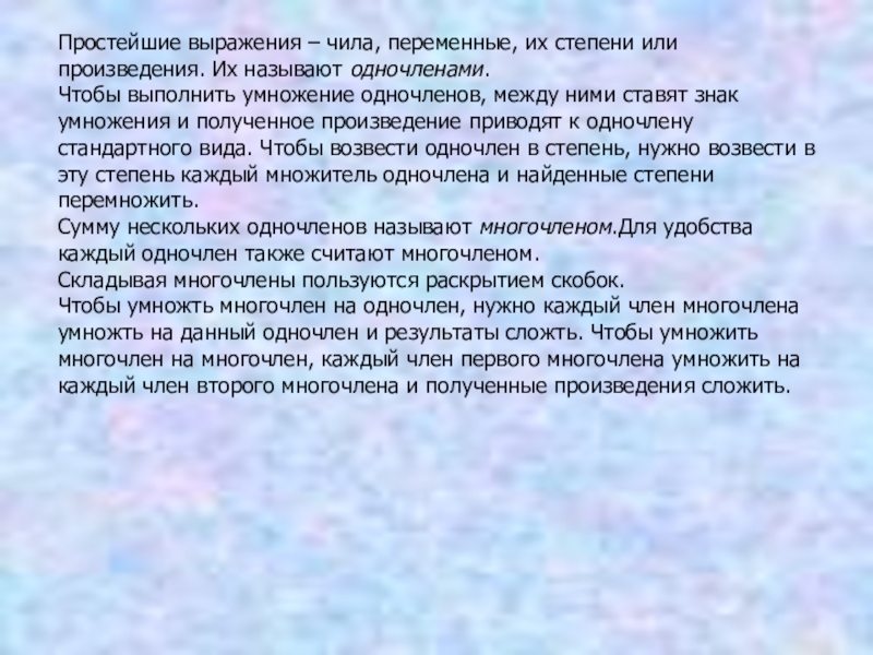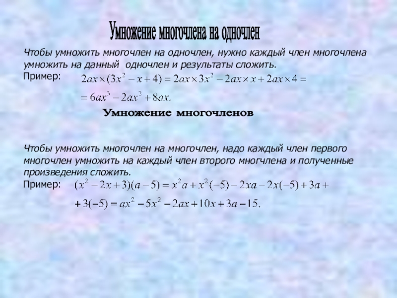 Чтобы умножть многочлен на одночлен, нужно каждый член многочлена умножть на данный одночлен и результаты сложть. Чтобы умножить многочлен на многочлен, каждый член первого многочлена умножить на каждый член второго многочлена и полученные произведения сложить.