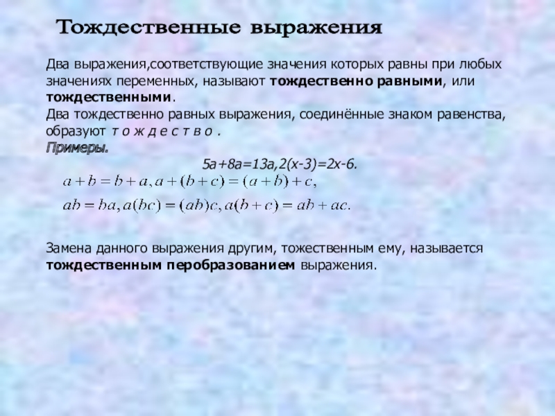 Два целых выражения, соответствующие значения которых равны при любых значениях переменных, называют тождественно равными, или тождественными. Два тождественно равных выражения, соединённые знаком равенства, образовывают тождество.