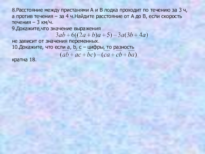Слайд 258.Расстояние между пристанями А и В лодка проходит по течению за