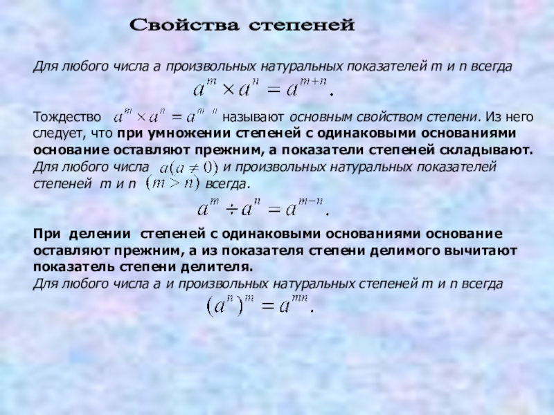 Тождество называют основным свойством степени. Из него следует, что при умножении степеней с одинаковыми основаниями основание оставляют прежним, а показатели степеней складывают.