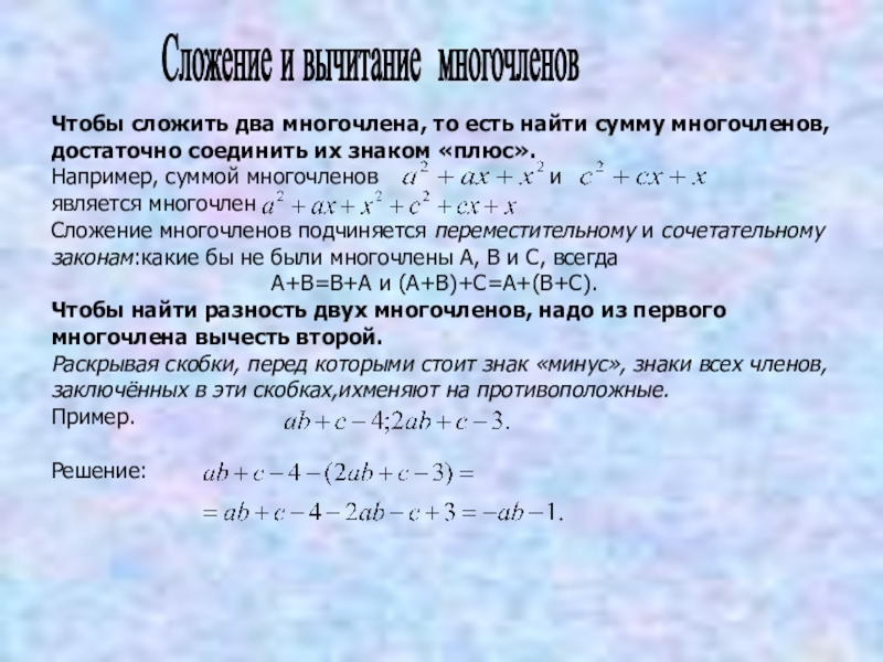 Сложение многочленов подчиняется переместительному и сочетательному законам:какие бы не были многочлены А, В и С, всегда