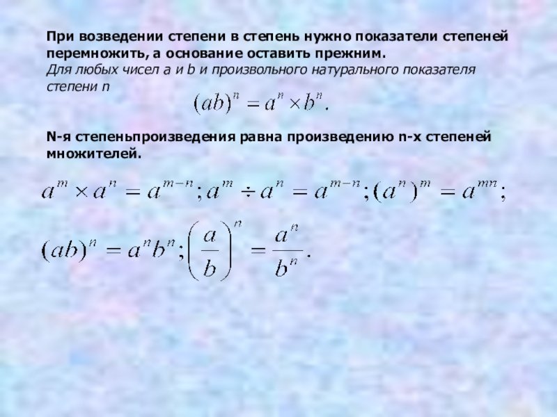 Слайд 9При возведении степени в степень нужно показатели степеней перемножить, а основание
