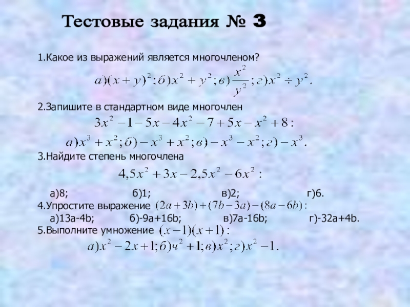 Считают, что многочлен записан в стандартном виде, если все его члены – одночлены стандартного вида и среди них нетподобных.