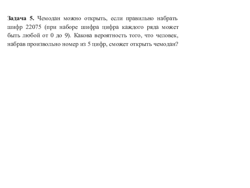 Слайд 23Задача 5. Чемодан можно открыть, если правильно набрать шифр 22075 (при
